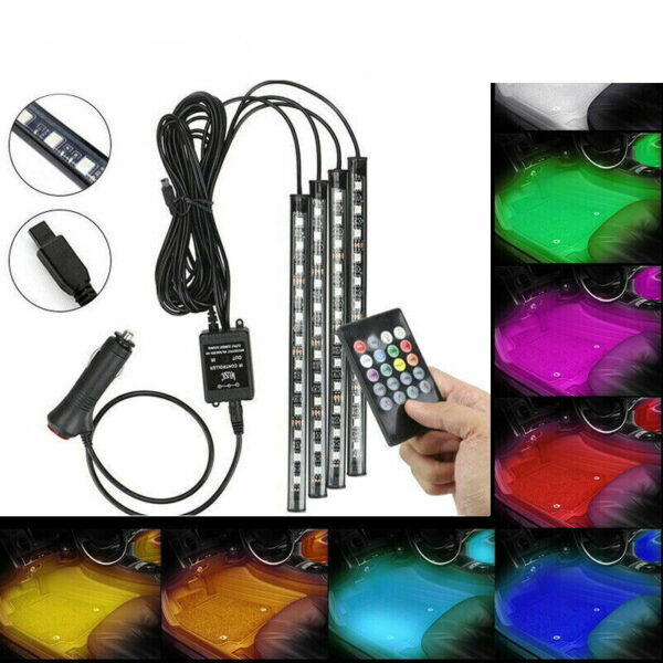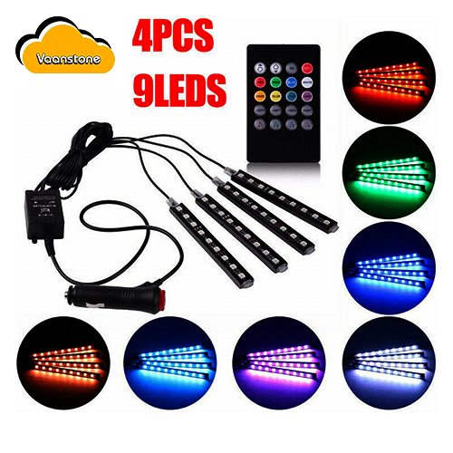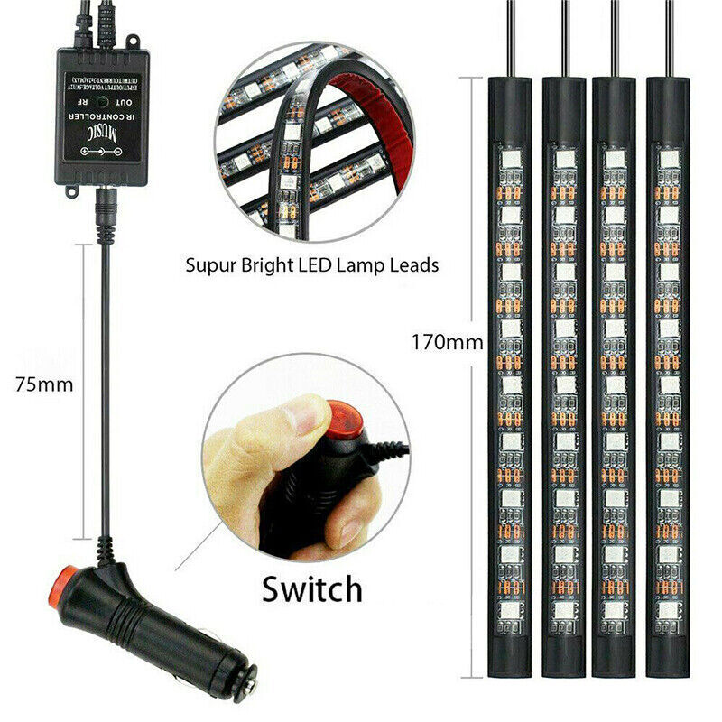 4X 12V 9LED RGB Car Interior LED Strip Lights Wireless Remote Control Music AU