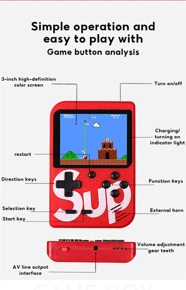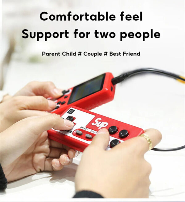 - Portable Game Console built-in 1000mAh Rechargeable lithium battery. The game can play for up to 7-8 hours each time it is fully charged.